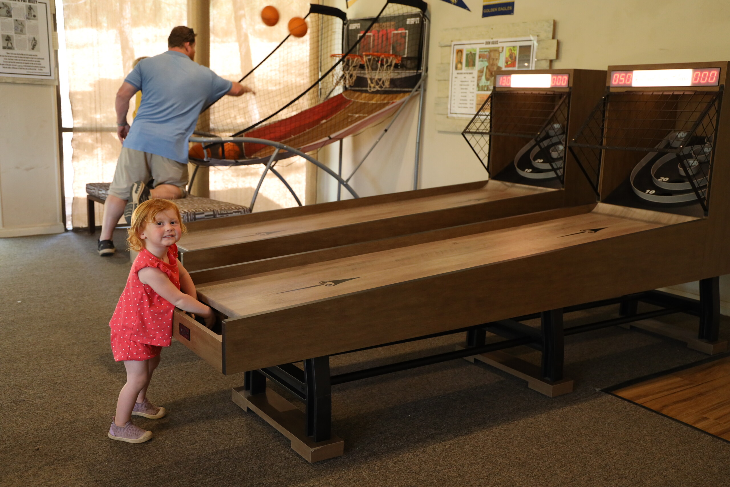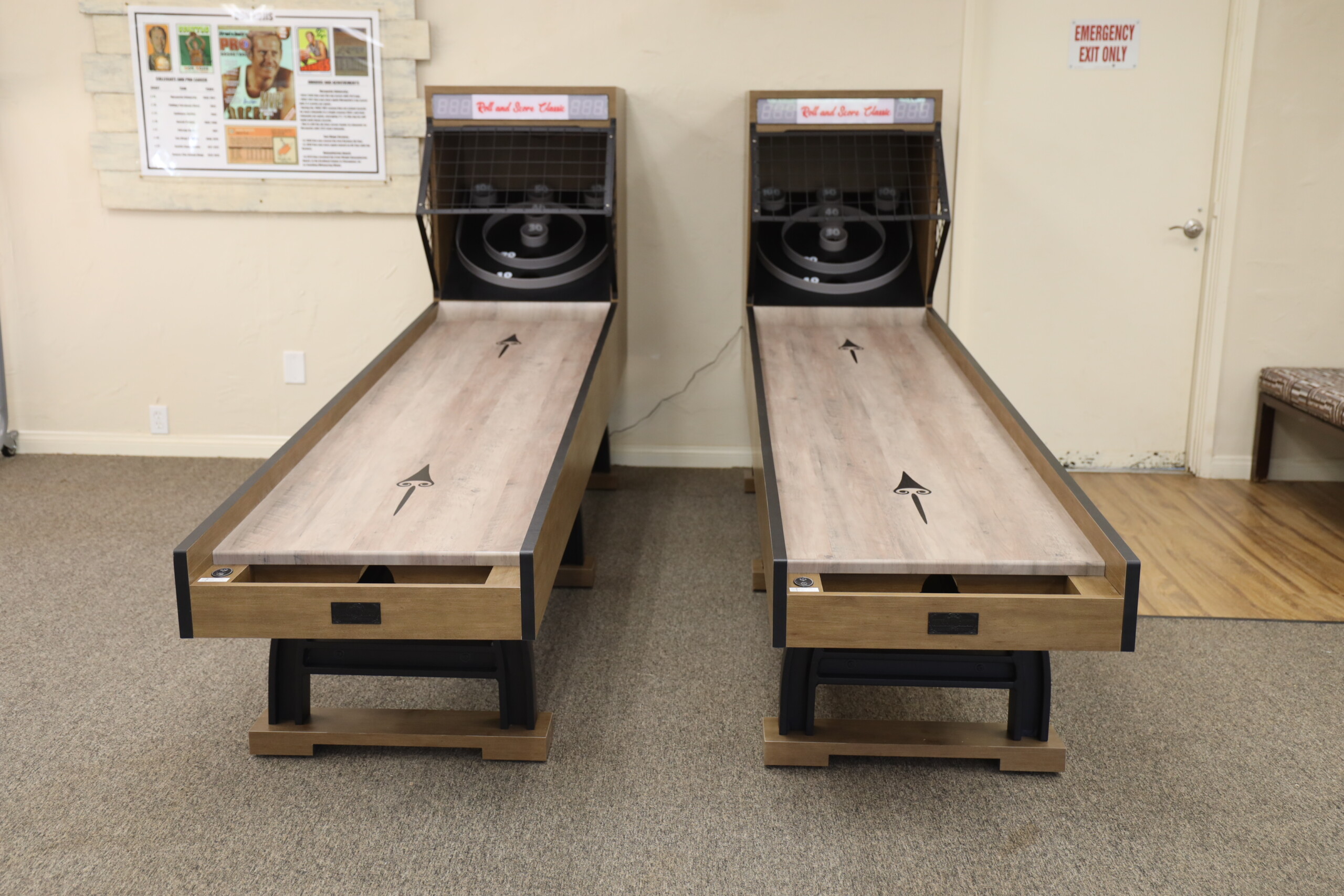 Skeeball can be found in our Gameroom! It’s a game for all ages. It is played by rolling a ball up an inclined lane and over a “ball-hop” hump (resembling a ski jump) that jumps the ball into bullseye rings. The object of the game is to collect as many points as possible by having the ball fall into holes in the rings which have progressively increasing point values.