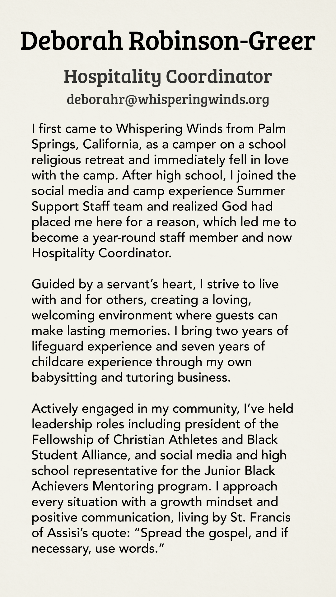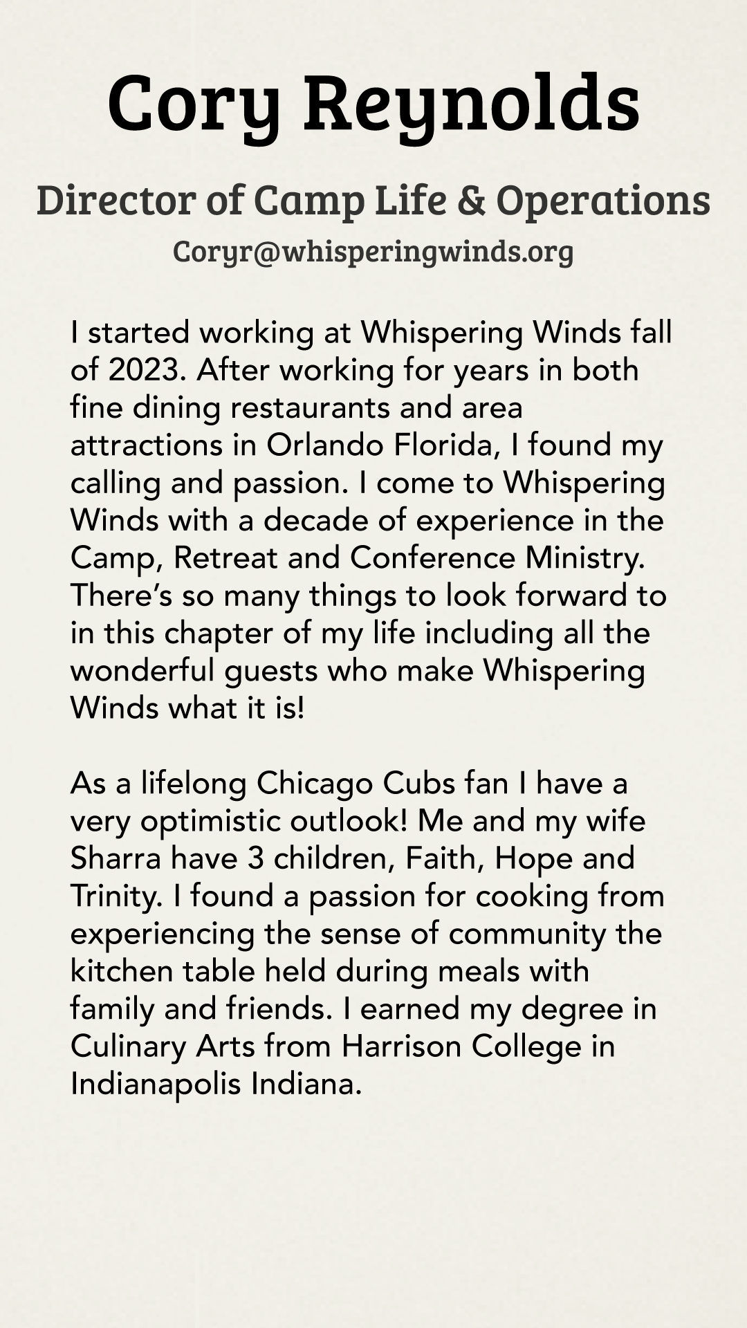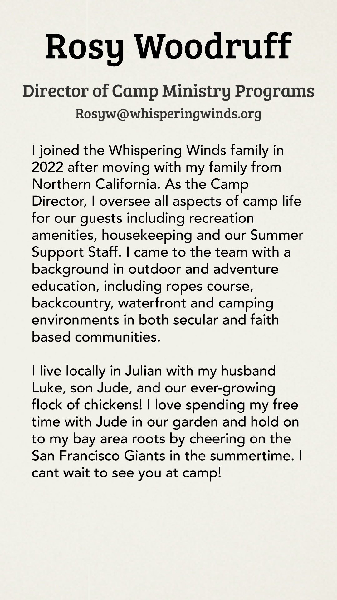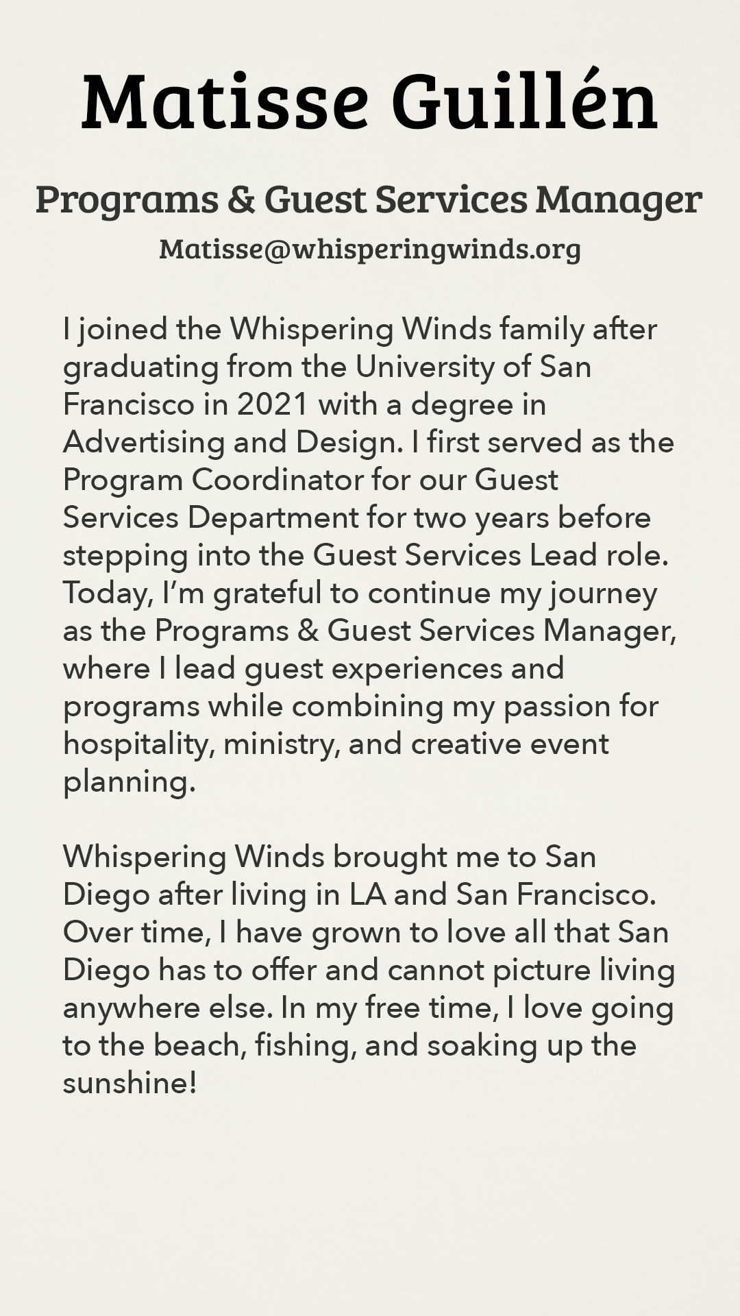 The staff at Whispering Winds is united in their commitment to upholding our mission and ensuring that every guest has an exceptional experience. Our office team oversees vital operations such as programs, marketing, finances, guest services, and administration, while the camp staff creates a warm, enriching atmosphere by maintaining our facilities and coordinating activities that bring our mission to life.