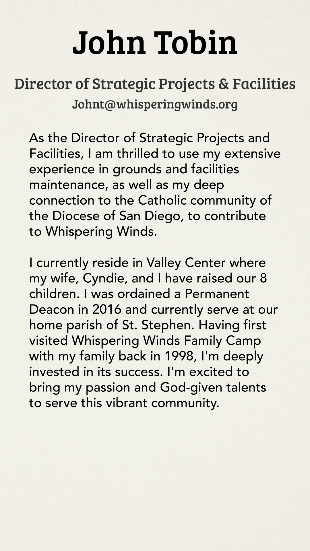Michael is honored to serve on the Whispering Winds Board and supports its mission of peace, renewal, and spiritual growth.